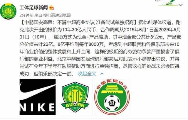 過去十年里,中超聯(lián)賽的球衣、裁判服、比賽用球都是耐克提供贊助,十年的合約在今年就將到期。據(jù)相關(guān)媒體報道,足協(xié)又與耐克簽訂了新的中超聯(lián)賽贊助合同,耐克此次開出的報價為10年30億人民幣,合作周期從2019年6月1日至2029年5月31日(10年),贊助方式為現(xiàn)金+產(chǎn)品贊助,其中現(xiàn)金部分共計8億元,產(chǎn)品部分價值共計22億。