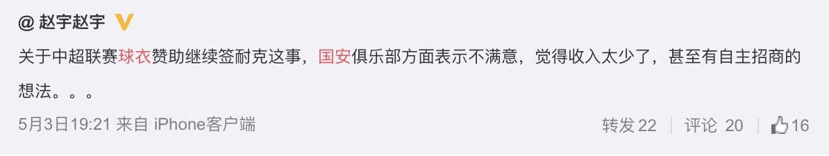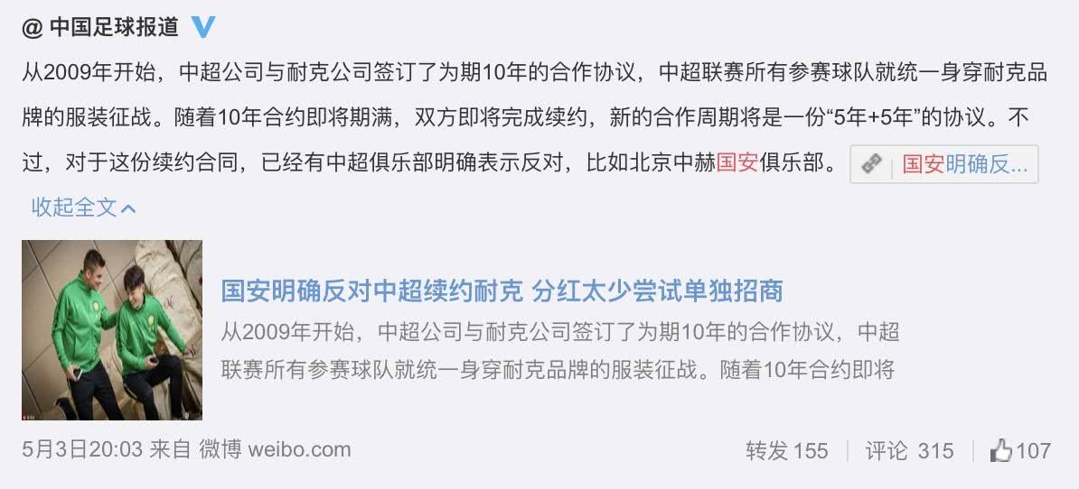 在耐克與中超公司就球衣贊助續(xù)約一事越談越近的同時,終于有球隊站了出來,第一次正式表達出對于球衣贊助“大鍋飯”的不滿——北京國安不同意中超公司與耐克進行續(xù)約,甚至會在下半年嘗試球衣自主招商贊助!