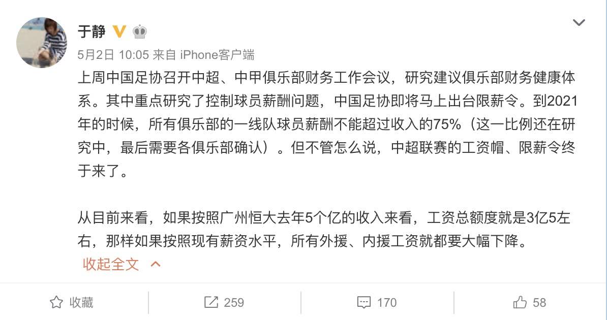 然而可怕的是,在球衣贊助鬧得風風雨雨的同時,足協(xié)卻傳出了“限薪”的禁令——到2021年的時候,所有俱樂部的一線隊球員薪酬不能超過收入的75%(這一比例還在研究中,最后需要各俱樂部確認)。