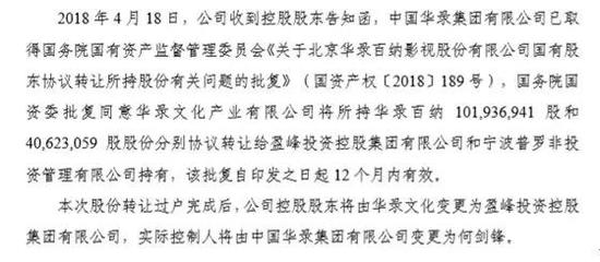 近日,華錄百納收到控股股東告知函,國務(wù)院國資委已經(jīng)批復(fù)同意了華錄文化的股權(quán)轉(zhuǎn)讓,上市公司控股股東將由華錄文化變更為盈峰集團,實際控制人將由中國華錄集團有限公司變更為何劍鋒。這意味著,作為目前唯一的國有控股影視文化上市公司的華錄百納,將正式成為民營控股企業(yè)。\u00A0