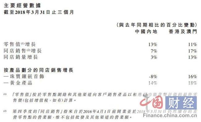 中國網(wǎng)財經(jīng)4月17日訊\u00A0\u00A0昨日,周大福珠寶集團(tuán)發(fā)布截至2018年3月31日止三個月未經(jīng)審核主要經(jīng)營數(shù)據(jù)。截至3月底2018財年四季度,周大福港澳和內(nèi)地市場同店銷售分別增長17%和7%,同店銷量增幅分別為13%和3%,零售額增幅分別為11%和13%。