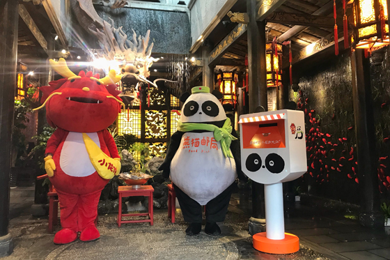除了這張有代表性的創(chuàng)作,限量發(fā)行的每張明信片上都有或可愛或霸氣的龍和憨厚的熊貓。奇妙的跨界碰撞,頓時(shí)吸引了上千名游客駐足,紛紛索取明信片書寫并投遞在專屬郵筒中,現(xiàn)場(chǎng)人頭攢動(dòng)。客人們還不忘在現(xiàn)場(chǎng)與小龍俠人偶、中國(guó)龍背景、熊貓郵筒合影,在成都地標(biāo)建筑留下自己的獨(dú)特記憶。