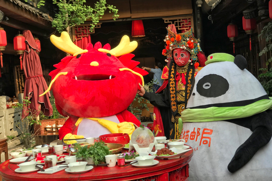 首發(fā)儀式后,火鍋明信片的兩位主角——小龍俠和熊貓YOYO以游客身份游覽了寬窄巷子,兩只萌寵像來成都旅游的游客一樣去感受成都掏耳朵文化、一起去品嘗春茶、一起去感受川劇變臉文化、最后一起寫明信片和涮火鍋度過了完美的一天。(王涵希)