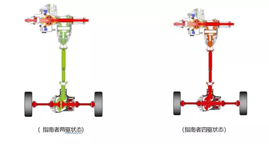在行駛過程當(dāng)速度達(dá)到40KM/H,路況環(huán)境好的情況下,指南者車輛即切換至兩驅(qū)狀態(tài)行駛。在兩驅(qū)模式下,后軸進(jìn)行智能分離,中央傳動軸后橋差速器減速齒輪完全靜止,借此技術(shù)可實現(xiàn)3%到4%的油耗降低,相當(dāng)于0.3升/百公里。