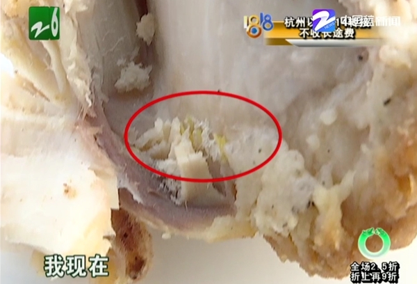 尹先生:“這個最后一桶是開完會吃的,吃的時候,最后一塊吃的時候,發(fā)現(xiàn)蟲卵,我老婆手撕的時候,撕到了。”