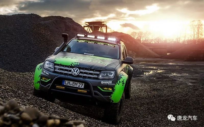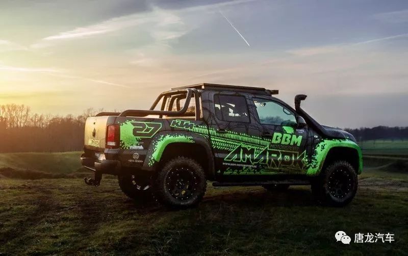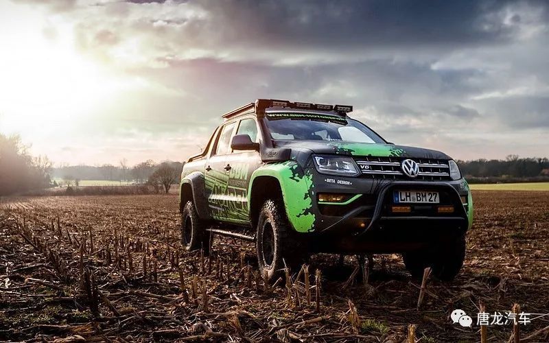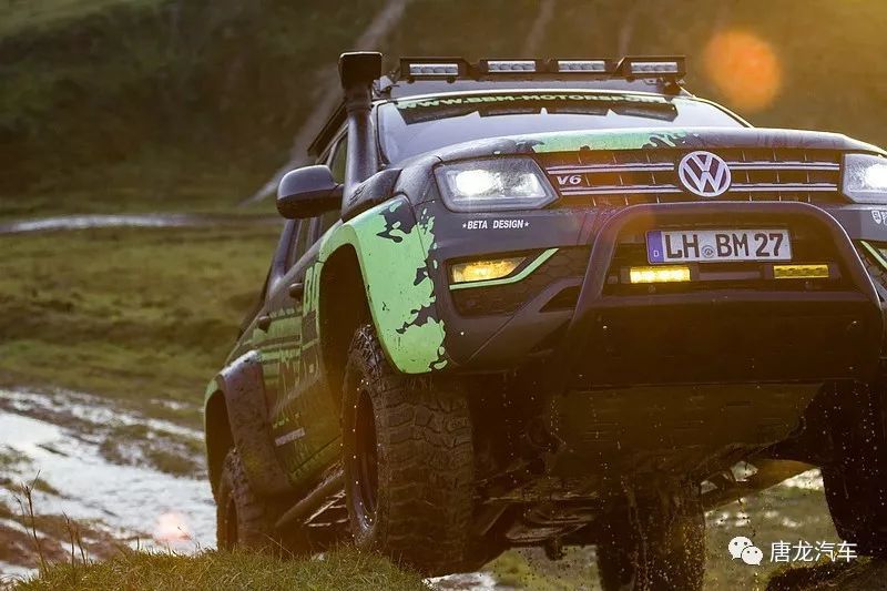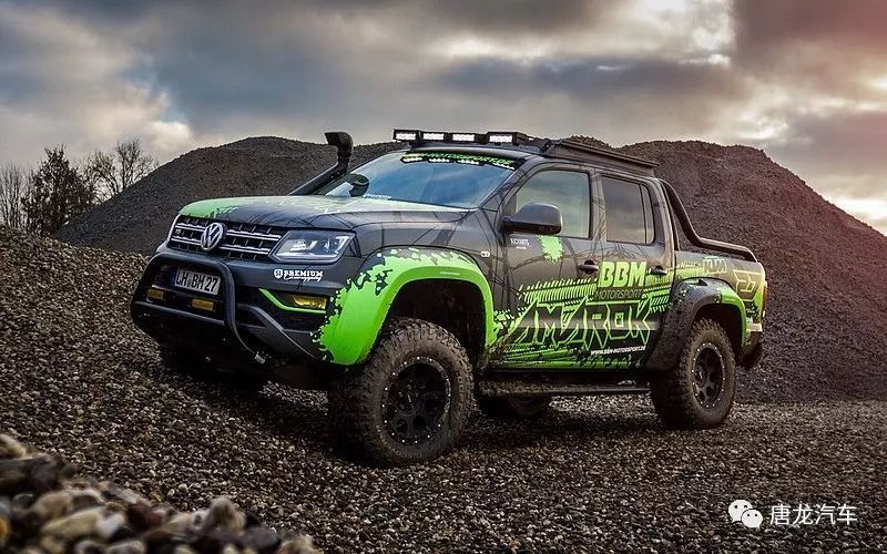 這輛由BBM Motorsport操刀改造的Amarok V6,在外觀方面首先藉由換裝Delta 4×4車身抬舉系統(tǒng)增加100mm的高度,搭配加裝車頭/車側(cè)防護(hù)桿、寬體葉子板/外擴(kuò)輪拱、前后下護(hù)板、LED投射燈、進(jìn)氣呼吸管等部品,搭配18寸鋁圈以及尺碼為305/60-18的Cooper STT Pro越野胎,甚至還可選擇將車高再提高40mm,并換上更大的305/70-18尺寸配胎,最后于車身師以亮眼的綠色彩繪,造就出相當(dāng)搶眼的風(fēng)貌。