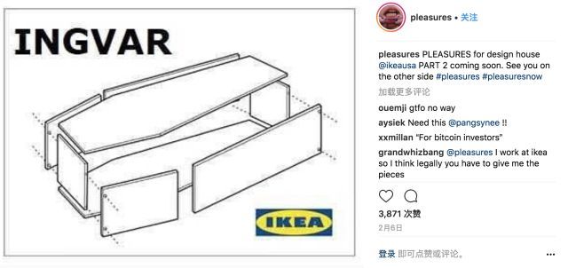 今年2月,作為最早一批在IKEA FRAKTA購(gòu)物袋上吃螃蟹的品牌PLEASURES,甚至在自己社交媒體上發(fā)布了一個(gè)聯(lián)名棺材,這個(gè)“潮流”單品,確實(shí)把IKEA聯(lián)名玩兒的有點(diǎn)意思了。