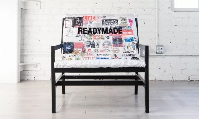 在這個(gè)聯(lián)名發(fā)布不久,READYMADE也放出了自己的改造方案:用定制的鋁箔和100余張帶有潮流元素的貼紙,再加上自己經(jīng)典的READYMADE Logo,將「SP?NST」中的靠椅變得更加READYMADE。