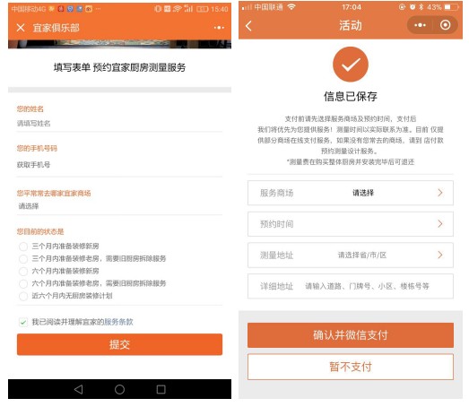 而現(xiàn)在小程序接入微信支付后,用戶填寫預約信息后就可以直接線上支付;如果用戶因為各種原因要求退款,也可以在小程序中完成測量費退款的流程。與此前相比,微信支付幫助用戶實現(xiàn)了測量費的全在線處理,大幅簡化了宜家廚房購買流程,顧客流失率下降了約9%,回訪調(diào)查的消費者滿意度也明顯提升。