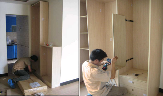 安裝完畢,師傅又開始對(duì)柜體進(jìn)行檢查,確保柜體牢固、接縫緊密、移門順暢,并用自帶的毛刷、清潔劑和抹布把產(chǎn)品擦拭得干干凈凈。最后整理工具,打掃現(xiàn)場(chǎng)。