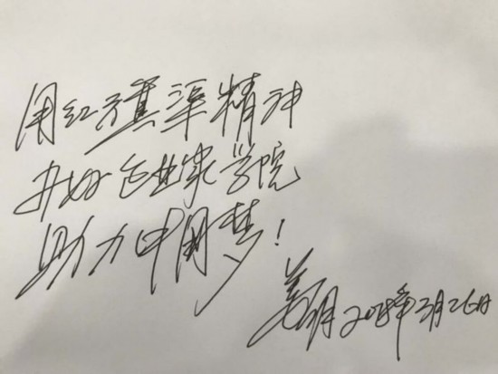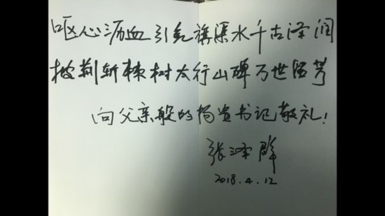 央視主持人、紅旗渠企業(yè)家學(xué)院發(fā)起人之一張澤群關(guān)注紅旗渠近30年,多年來致力于弘揚紅旗渠精神。1990年,24歲的張澤群就深入林縣山區(qū),拍攝了紀(jì)錄片《山碑》;2014年,又為楊貴同志拍攝口述歷史資料紀(jì)錄片《楊貴訪談錄》,對紅旗渠精神的傳播起到了巨大的推動作用。獲悉老書記去世的消息后,張澤群非常難過,立即趕赴老書記家中祭拜,并揮筆寫下了“向父親般的楊貴書記敬禮”的題詞。