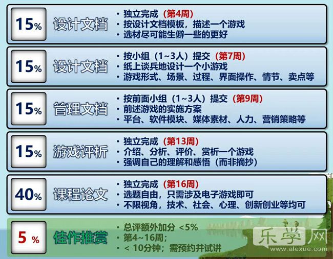 根據(jù)安排,授課內(nèi)容囊括了發(fā)展史、職業(yè)體系和崗位職責(zé)、設(shè)計流程、網(wǎng)游、手游、開發(fā)工具、用戶體驗、未來技術(shù)、電子競技等十多個方面,而學(xué)生也需要提交游戲的設(shè)計文檔、管理文檔、游戲評析作為課程作業(yè)。為保證專業(yè)性,陳江還專門邀請了北大心理輔導(dǎo)中心的同事來主講電子游戲涉及到的人性、倫理道德、成癮與克服等問題。