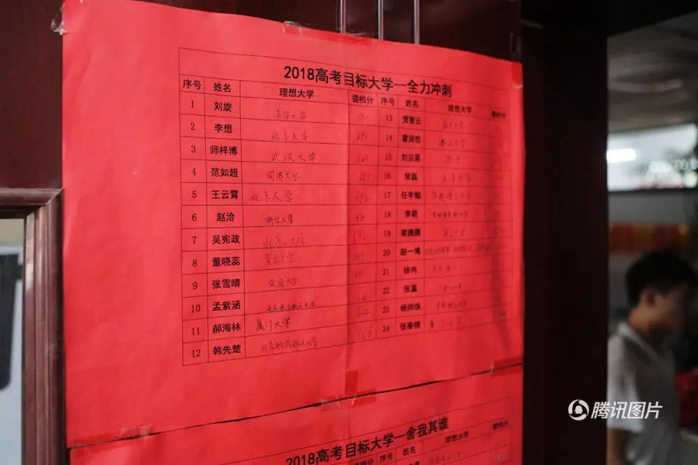 一個高三教室的門上貼著寫有學(xué)生們高考目標(biāo)大學(xué)的紅紙。這樣可以讓學(xué)生們每次進(jìn)出教室門的時候都可以看到自己定下的夢想,不忘初心。