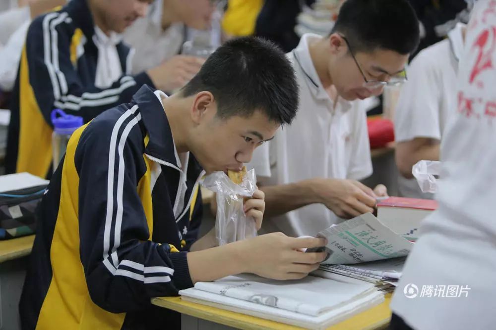 幾名高三學(xué)生在教室內(nèi)聚在一起吃午飯,他們每頓飯輪流去排隊(duì)買飯,這樣其他人可以多學(xué)一會兒。