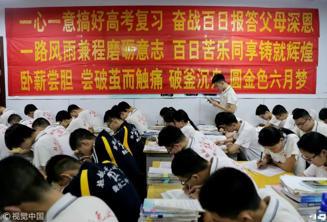 高三學(xué)生在掛滿各種勵志標(biāo)語的教室內(nèi)參加模擬考試。