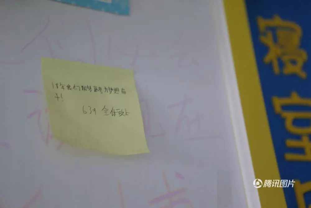 高三年級男生639宿舍門口展示板上,一張便簽紙上寫有“18年我們圓夢高考 為夢想奮斗!”的話語。