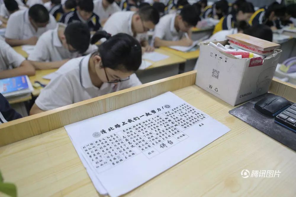 高三學(xué)生在教室內(nèi)上自習(xí),講臺上的座次表上印有“清北路上我們一起努力”。