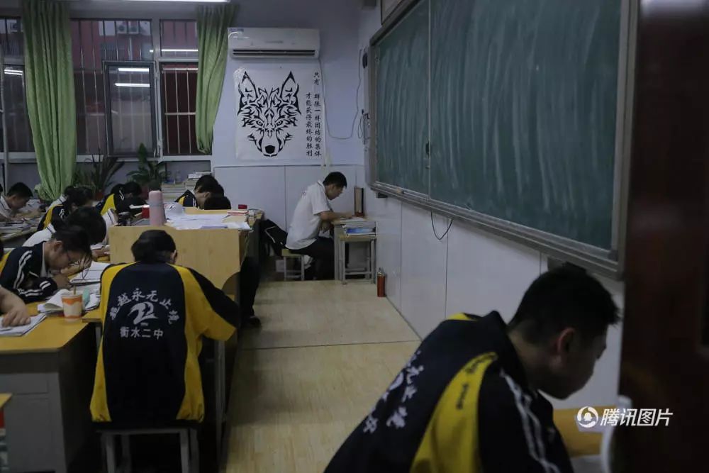 高三學(xué)生在教室內(nèi)學(xué)習(xí)。該班教室前面墻上一個狼頭像,班主任希望學(xué)生們像狼頭旁邊的小字上寫的那樣,班集體應(yīng)該像群狼那樣團(tuán)結(jié)在一起,共同迎接高考的到來。