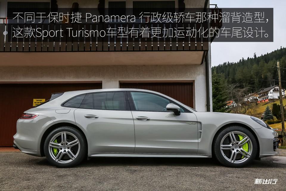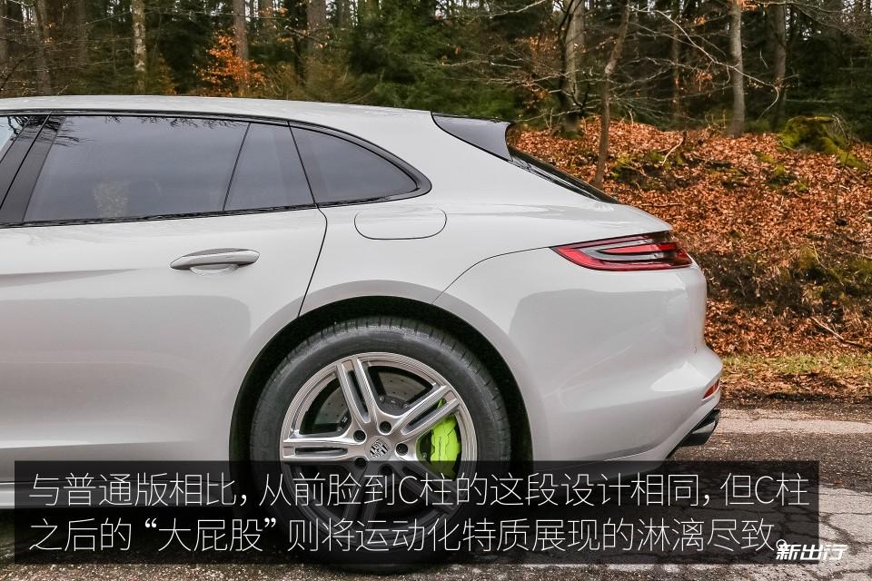 不同于保時(shí)捷 Panamera 豪華行政級(jí)轎車那種溜背的造型,這款 Sport Turismo(獵裝版)車型有著更加運(yùn)動(dòng)化的車尾設(shè)計(jì)。其實(shí)與普通版相比,從前臉到 C 柱這段的外觀設(shè)計(jì)完全一致,而 C 柱之后的“大屁股”則將運(yùn)動(dòng)化特質(zhì)展現(xiàn)的更加淋漓盡致,尤其是頂部還配有黑色的擾流器。