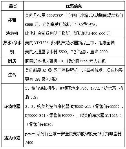 不僅美的空調(diào)有大量?jī)?yōu)惠,5月18日至20日,美的其他八大品類均有優(yōu)惠惠顧消費(fèi)者,具體優(yōu)惠信息如下表: