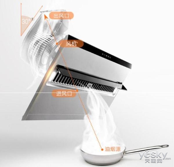 從結(jié)構(gòu)上來看,側(cè)吸式油煙機(jī)位于燃?xì)庠畹膫?cè)面,并通過側(cè)面進(jìn)風(fēng)技術(shù)來吸入產(chǎn)生的油煙。有些人會(huì)擔(dān)心側(cè)吸式油煙機(jī)能否完全將油煙吸凈,側(cè)吸的方式似乎并沒有辦法完全將上騰的油煙吸走。方太云魔方JQ25TS與墻壁呈30°夾角,并將出風(fēng)口、風(fēng)機(jī)、進(jìn)風(fēng)口、油煙源四點(diǎn)放置在一線,可減少吸力的損失,讓油煙可快速被吸走。