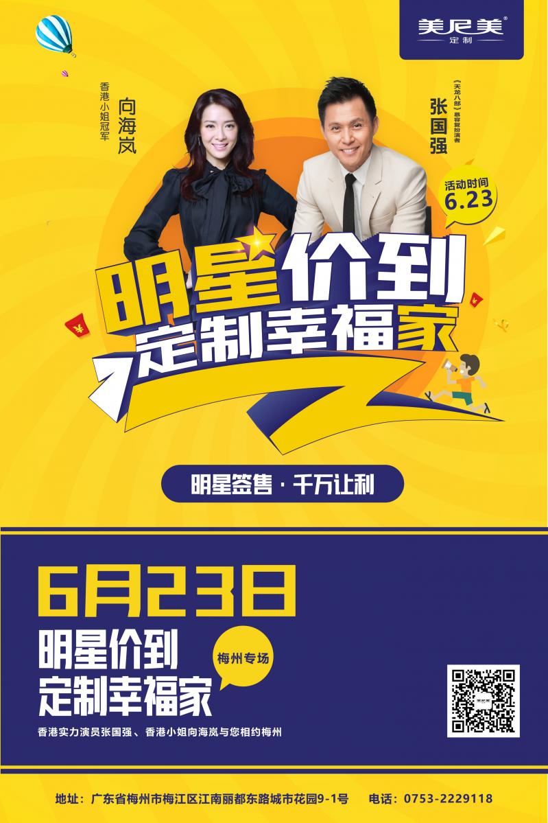 6月23日的廣東梅州星光熠熠,美尼美定制攜手張國 強和向海 嵐兩大實力演員匯聚一堂,與廣大消費者共享傾城鉅 惠盛宴。大明星推薦爆款衣柜大勢襲來,給你明星價,為你定制幸福家,更有各式壕禮送不停!同時,還能與明星親密互動,滿足你的追星夢。