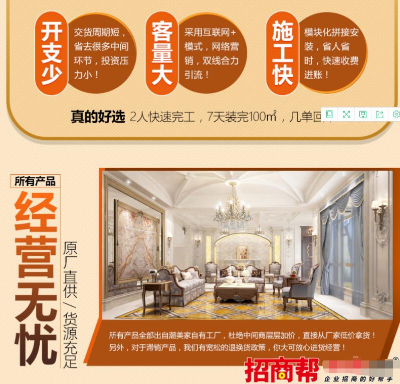 通過潮美家品牌負(fù)責(zé)人了解到,現(xiàn)在合作潮美家集成裝飾,無需任何合作代理費用,潮美家總部自有大型生產(chǎn)基地,所有產(chǎn)品自有生產(chǎn),合作商可以以最低的價格拿貨,無店也可以經(jīng)營,潮美家總部將對合作商一站式全程幫扶,助力創(chuàng)業(yè)者輕松賺錢。