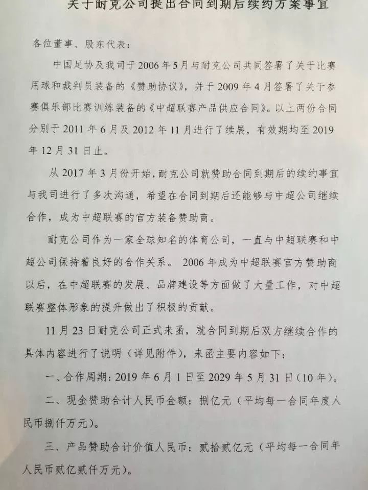 中超聯(lián)賽和耐克的淵源可以追溯到2006年5月,當時中國足協(xié)、中超公司、耐克公司三方共同簽署了關(guān)于比賽用球和裁判員裝備的《贊助協(xié)議》,并于2009年4月簽署了關(guān)于參賽俱樂部比賽訓練裝備的《中超聯(lián)賽產(chǎn)品供應(yīng)合同》。以上兩份合同分別于2011年6月及2012年11月進行了續(xù)展,有效期均至2019年12月31日止。