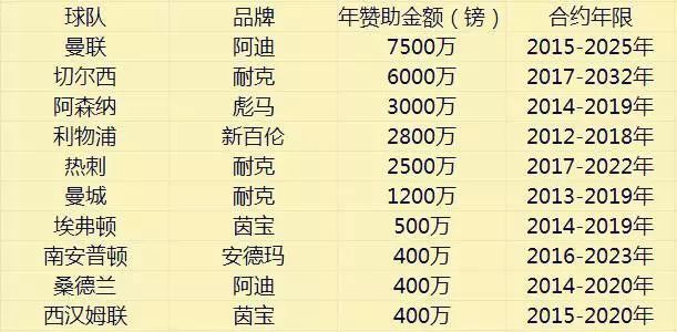 ▼英格蘭俱樂部球衣贊助合同前十,其中桑德蘭已降入英冠
