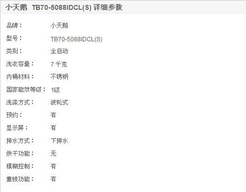 [家電網(wǎng)HEA報(bào)道]1月16日消息:時(shí)代的進(jìn)步,科技的發(fā)展,我們的生活節(jié)奏也越來的越快。在這個(gè)快節(jié)奏的時(shí)代里,什么都講求高效率,效率高才是硬道理。家電網(wǎng)小編搜羅賣場(chǎng),發(fā)現(xiàn)了一款外觀時(shí)尚、功能強(qiáng)大的小天鵝洗衣機(jī)TB70-5088IDCL(S),有興趣的朋友一起來看看吧。