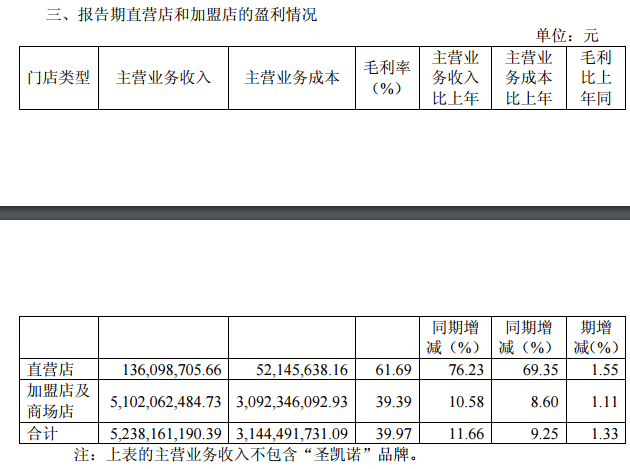 分渠道來(lái)看,直營(yíng)店收入1.36億元、同比增長(zhǎng)76.23%,加盟店及商場(chǎng)店收入51.02億元、同比增長(zhǎng)10.58%。