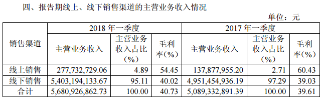 分線上線下來(lái)看,公司線下收入仍占主導(dǎo)(收入占比95.11%),但線上增速明顯提升、表現(xiàn)亮眼。其中,2018Q1線上收入2.78億元、同比增101.43%受益于線上活動(dòng)力度加強(qiáng),收入占比自2017Q1的2.71%提升至4.89%,線下收入54.03億元、同比增長(zhǎng)9.12%。
