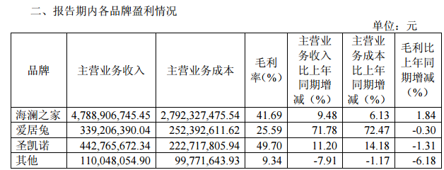 分品牌來(lái)看,海瀾之家主品牌收入47.89億元、同比增長(zhǎng)9.48%,愛(ài)居兔收入3.39億元、同比增長(zhǎng)71.78%,圣凱諾4.43億元 、同比增長(zhǎng)11.20%,其他(海一家等)1.10億元、同比下降7.91%。