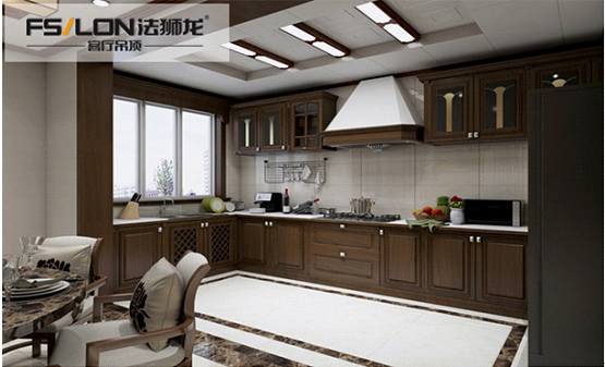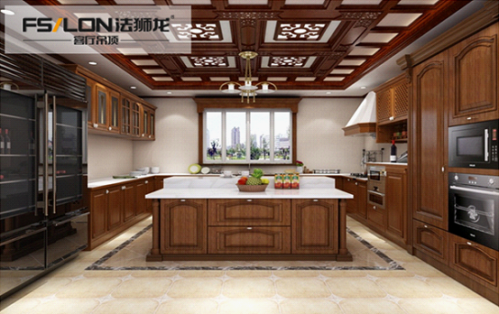 接下來給大家介紹的系列是:1、美式風(fēng)格廚房法獅龍吊頂 -——特點:廚房在美國人眼中一般是開敞的(由于其飲食烹飪習(xí)慣),同時需要有一個便餐臺在廚房的一隅,還要具備功能強(qiáng)大又簡單耐用的廚具設(shè)備,如水槽下的殘渣粉碎機(jī),烤箱等。需要有容納雙開門冰箱的寬敞位置和足夠的操作臺面。在裝飾上也有很多講究,如喜好仿古面的墻磚、櫥具門板喜好用實木門扇或是白色模壓門扇仿木紋色。另外,廚房的窗也喜歡配置窗簾等。
