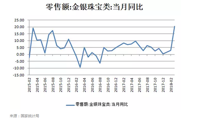 從數據來看,國家統(tǒng)計局在4月17日公布了2018年第一季度的社會零售總額數據,隨著我國居民收入的穩(wěn)步增長,消費新動能快速成長,整體消費活躍,社會消費品零售總額為29,194億元,同比增長為10.1%,其中金銀珠寶零售總額表現亮眼,2018年3月,零售額同比增長高達20.4%。