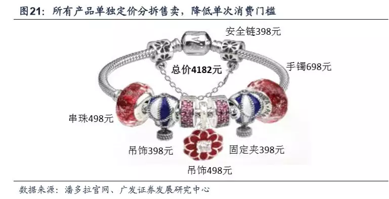 近年崛起的珠寶品牌潘多拉(Pandora)的興起,也印證了消費者對于珠寶日常消費和個性化產品的喜愛。潘多拉為丹麥哥本哈根的珠寶品牌,獨創(chuàng)“串飾手鏈”概念,允許消費者按照自我喜好和風格DIY設計組合串飾手鏈,獲得消費者追捧。