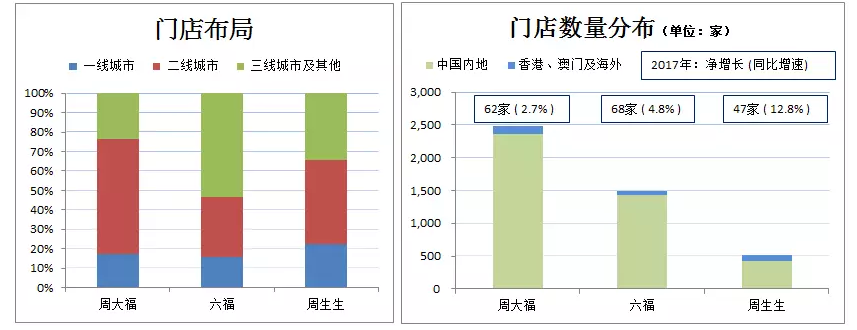 從同店增速來看,周生生近幾年是最快;從實際數量來看,周大福則是最多。不過,考慮到未來的消費格局將下沉至三四線城市,在此范圍重點布局的六福應最為受益。