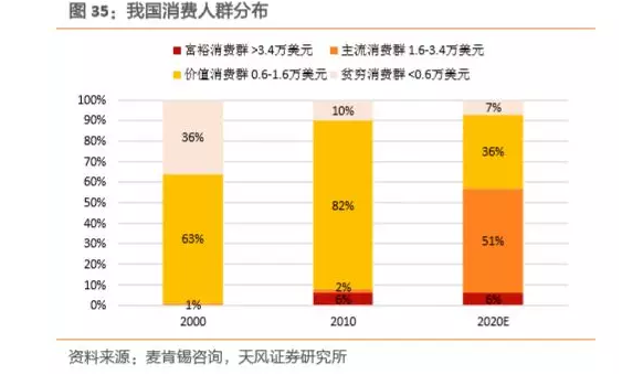 隨著中國經濟持續(xù)增長,人均收入勢必屢創(chuàng)新高。根據麥肯錫咨詢數據,2020年預計我國年消費在1.6-3.4萬美元的主流消費群體將占據整體消費人口的51%,對比2010年時期的2%將有顯著提升。