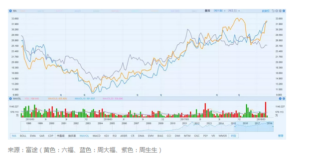 港資品牌一直深受國內消費者喜愛,周大福(1929.HK)、周生生(0116.HK)及六福集團(0590.HK)市占率均為行業(yè)領先地位。從三大港資珠寶品牌的市場表現來看,股價從2016年開始一路上揚。