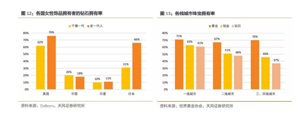 根據資料,對比美國達到70%的鉆石消費市場滲透率,我國目前僅為20%,意味擁有鉆石的人數比例遠遠低于發(fā)達國家,鉆石市場仍有巨大潛力。另一方面,從擁有珠寶的消費者來看,一線城市的消費力最強,因此其鉆石擁有率最高。