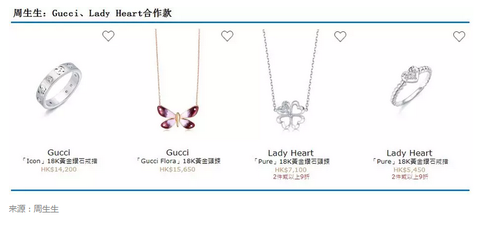 周生生的定位更為高端,且積極與國際知名品牌合作,設計個性的金飾品,其產品的時尚感較強。集團旗下還擁有包括與Gucci、Lady Heart和Sanrio聯(lián)名旗艦品牌,面向國際市場。從產品定位及設計感來看,周生生設計感較強,但價格較高。
