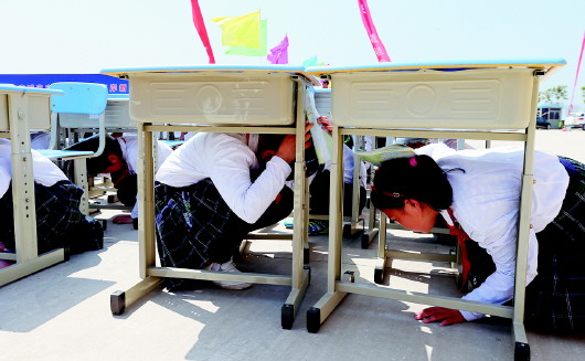 ◎在學(xué)校怎樣避震?正在上課時(shí),要聽從老師指揮,迅速抱頭閉眼,躲在課桌旁(下),背向窗戶,并用書包保護(hù)頭部;在操場或室外時(shí),可原地蹲下,用雙手保護(hù)頭部。注意避開高大建筑物或上方危險(xiǎn)物,不要回到教室。