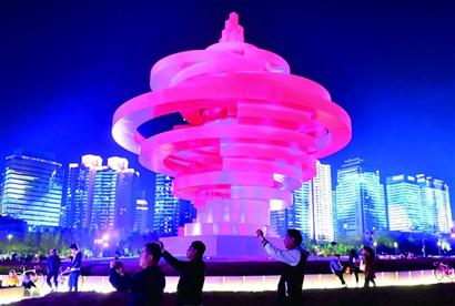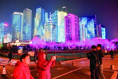 在五四廣場、奧帆中心環(huán)顧四周,多彩的燈光在樓宇間流動(dòng),變幻出各式圖案,映照著浮山灣畔的醉人夜色。市民和游客接踵而至,一邊贊嘆一邊拿出手機(jī)拍攝并與親友分享。