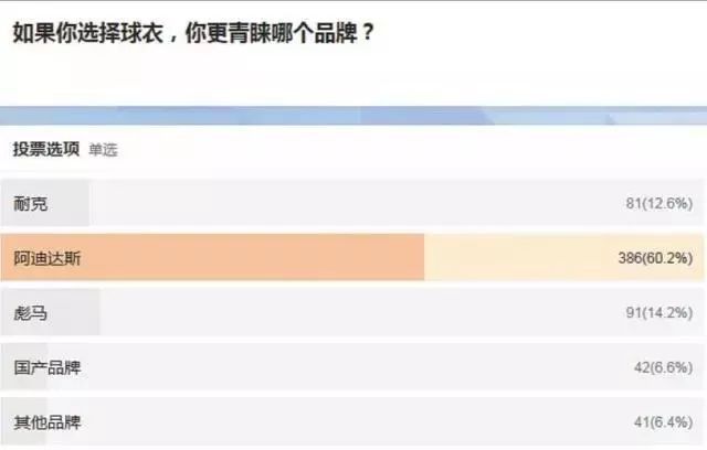 《足球周刊》官方微博隨后發(fā)布了調(diào)查,在“你是否支持耐克續(xù)約中超”的問題中,有超過85%的人選擇了“不支持”;在“如何評價耐克給中超聯(lián)賽帶來的影響”問題下面,80%的投票者選擇了“消極影響,阻礙商業(yè)化發(fā)展”,只有5%的人認為選擇了“積極影響,提升聯(lián)賽品質(zhì)”;而在“如果選擇球衣,你最青睞的品牌”的問題中,60%的票投給了阿迪達斯,彪馬排名第二,耐克的得票率只有13%。