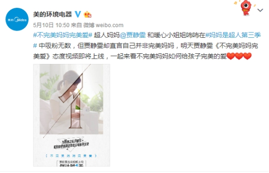 母親節(jié)之際,美的環(huán)境電器官方攜手賈靜雯發(fā)布《不完美媽媽完美愛》態(tài)度視頻,明星媽媽賈靜雯首度講述媽媽的不完美時(shí)刻心路歷程,引起廣大網(wǎng)友關(guān)注。