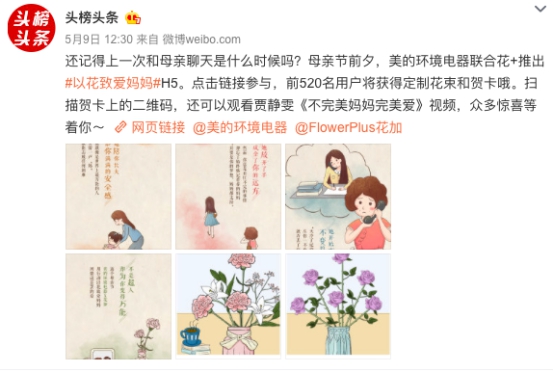 通過前期的預(yù)熱,同時(shí)跨界聯(lián)動(dòng)Flower Plus花+上線母親節(jié)暖心H5,送出“寵愛禮盒”為態(tài)度視頻制造聲量。母親節(jié)前夕,美的環(huán)境電器官博發(fā)布態(tài)度視頻,鏈接直接導(dǎo)流電商引流銷售,將聲量引入品牌陣地。打通各圈層KOL,取得對(duì)目標(biāo)人群的多維覆蓋,助力視頻傳播。