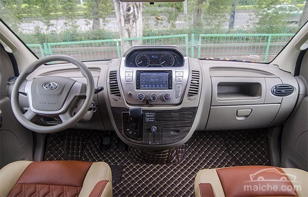 樂途的駕駛室中控臺(tái)為對(duì)稱式設(shè)計(jì),部分區(qū)域加入了仿木質(zhì)與銀色飾板,自上而下為儀表盤、多媒體與空調(diào)區(qū)域。