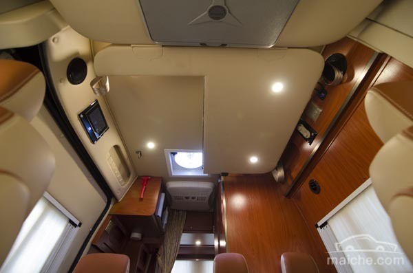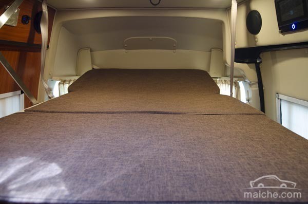 除了尾部固定的雙人床外,乘坐艙的內(nèi)頂還有一張隱置式雙人床,兩步即可從車內(nèi)頂降下,極大地節(jié)制了睡臥空間,簡(jiǎn)單便利,支架堅(jiān)實(shí),床面舒服。