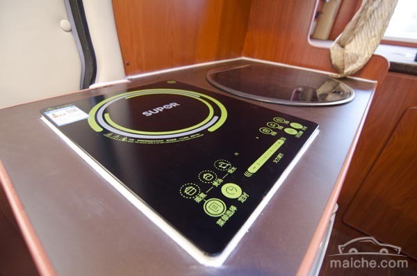 烹飪區(qū)與衛(wèi)生間面積稍顯局促,倒是配套設(shè)備比較齊全。臺(tái)面上設(shè)有燃?xì)庠钆c折疊式水龍頭,不使用時(shí)可以蓋上蓋板。