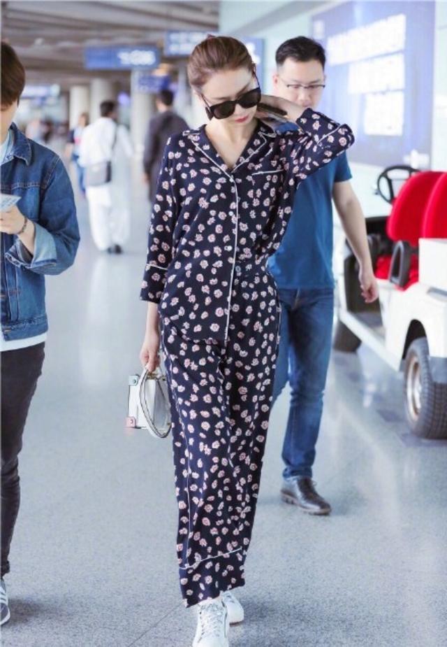 戚薇身穿藍色睡衣套裝搭配小白鞋,隨性又舒適,小小印花圖案透著些許清新文藝氣息,衣擺一邊塞進褲腰里更具時尚感,簡單扎起小馬尾,墨鏡遮面,輕輕松松凹出氣場。